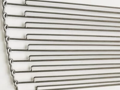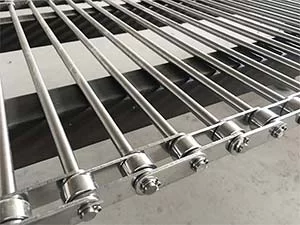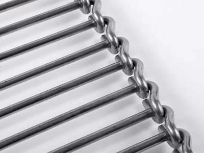 The Ladder belt with S-hooks run in straight applications but can also be executed as curved belts with a fixed inside radius. A belt variation with a tapered rod pitch assembly can be used in radial applications (90 and 180 degrees).