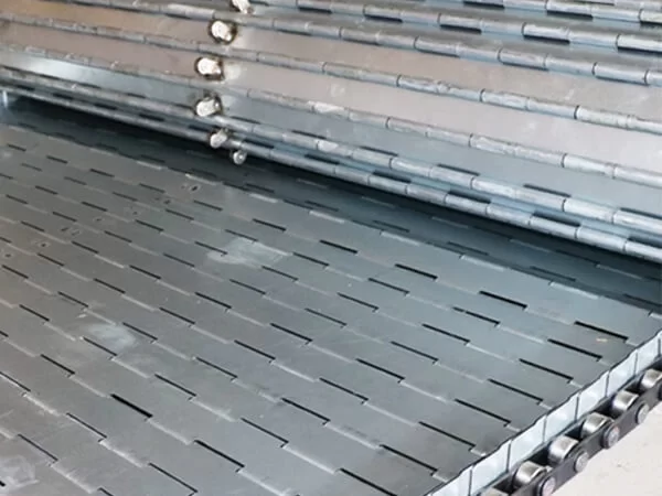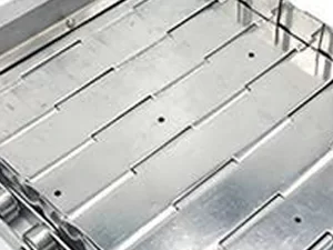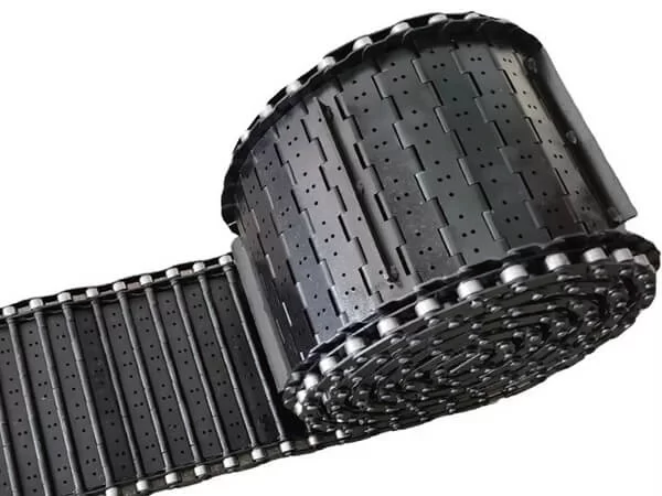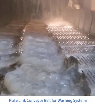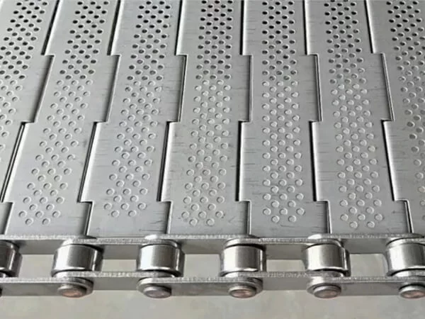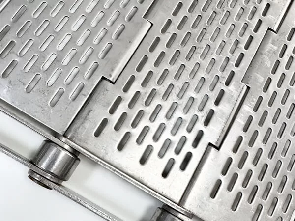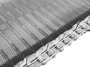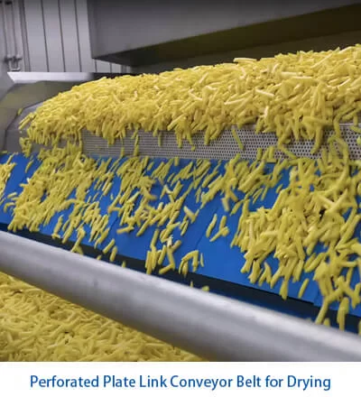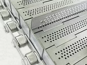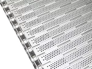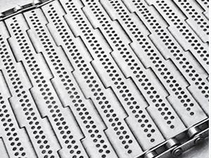 Plate conveyor belt consists of hinged slats with or without perforations. Perforated plate belt is ideal for drainage conveyor system. The size of perforation range can be custom, its possibility to have of al kinds of perforations to fit the product production line.