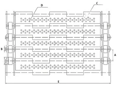 Hinged plate belts have side plates and cross flights in various combinations of height and thickness to suit different customers' requirements. They can satisfy light to heavy load capacity. Chain edge plate belts are also available in side plates and cross flights. The chains at both ends can be fixed with cotter pins or washers, which are convenient to disassemble and maintain.